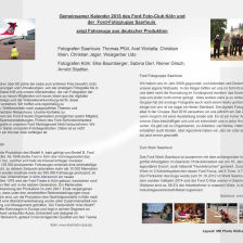 Das Ziel: Fotografieren von Fahrzeugen aus der aktuellen Produktion 2014 der deutschen Standorte Köln u. Saarlouis und die daraus folgende Erstellung des Kalender 2015 erfolgt in Zusammenarbeit mit dem Ford Foto-Club Köln und der Ford-Fotogruppe Saarlouis.