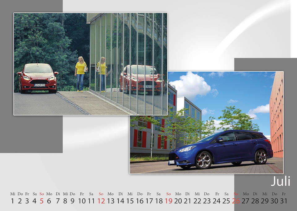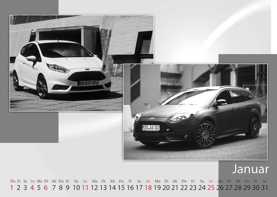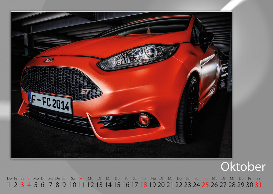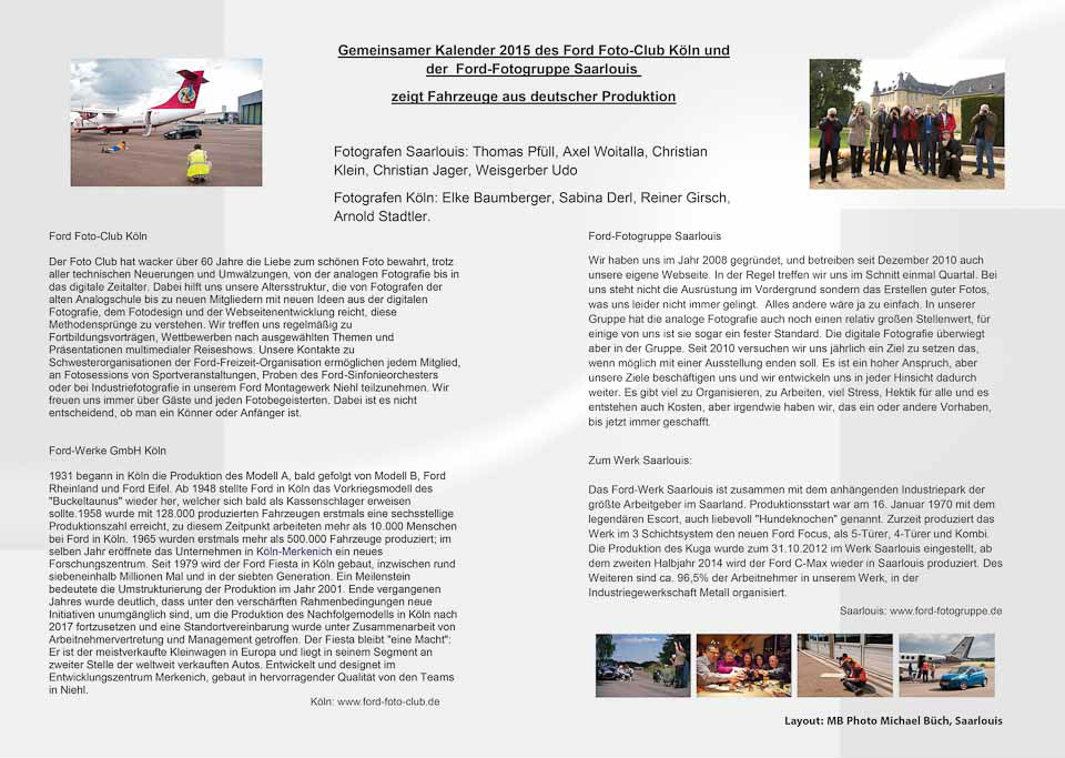 Das Ziel: Fotografieren von Fahrzeugen aus der aktuellen Produktion 2014 der deutschen Standorte Köln u. Saarlouis und die daraus folgende Erstellung des Kalender 2015 erfolgt in Zusammenarbeit mit dem Ford Foto-Club Köln und der Ford-Fotogruppe Saarlouis.