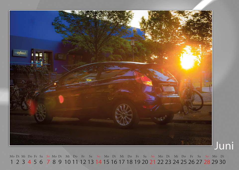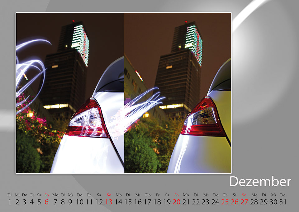 Autos kreativ für einen Kalender in Szene zu setzen ist eine Herausforderung, auch oder gerade, weil man bei einem Autohersteller arbeitet! Dieser anspruchsvollen Aufgabe näherte sich der Ford Foto-Club Köln und die Ford Fotogruppe Saarlouis auf sehr unterschiedliche Weise. Wir – der Ford Fotoclub – wollten es u.a. mit Light Painting versuchen und trafen uns mehrmals im Kölner Media Park und Umgebung zur Dämmerungsstunde, um die besten Locations auszumachen. Auch während der Vorbereitungen ergaben sich spontane Möglichkeiten, das Thema umzusetzen und so wurden vorbeirauschende Fahrradfahrer eingebunden und malerische Gegenlicht-situationen eingefangen. Der Osman 30-Turm mit seinem wechselnden Farbenspiel bot dann den Hintergrund für die eigentliche Light Painting Session bei Dunkelheit. Taschenlampen und LED-Leuchten kamen zum Einsatz, um auf den Fotos mit Langzeitbelichtung fantasievolle Spuren zu hinterlassen. Damit war jedoch nur die halbe Arbeit getan, denn wesentlich länger dauerte die Nachbearbeitung in Photoshop. Auch das Ergebnis der Foto Session am Fühlinger See wäre ohne die Aufarbeitung am Computer nur halb so witzig gewesen. Letztendlich aus der enormen Menge der Fotos die qualitativ besten auszuwählen stellte uns noch einmal vor eine zeitraubende Aufgabe. Alles in allem eine neue Erfahrung für uns, Fotos für einen Kalender zu erstellen, aber Spaß hat es gemacht und wir sind um einige Erfahrungen reicher.